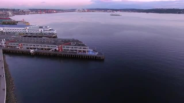 Aerial shot of a ferry boat arriving at the Seattle waterfront.