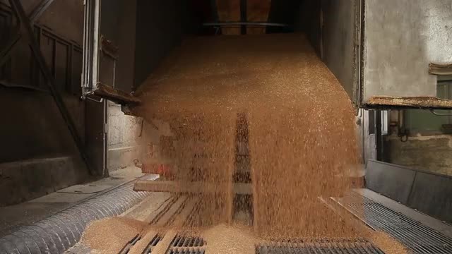 Kiev, Ukraine - Fedruary 2017: Wheat is unloaded from a truck at a flour mill. Wheat is strewing. Unloading of wheat grain. Transportation of wheat in a truck to a mill. Granary in the milling plant.