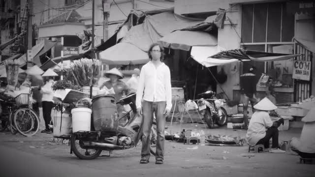 Time-lapse of man standing still at a busy market as the world whizzes by him