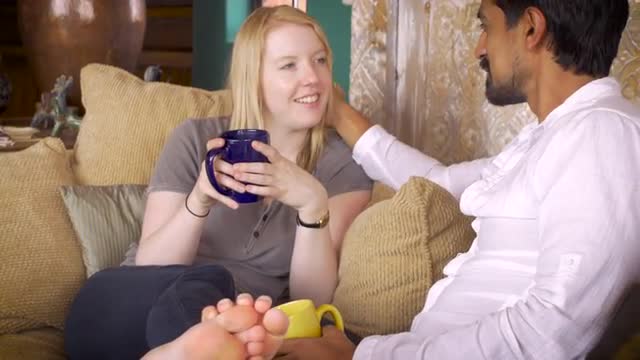 > An attractive hispanic man brings flowers to a young blond woman wide shot