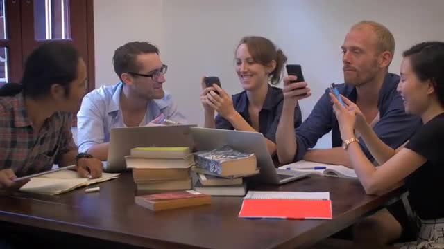 A mixed ethnic group of young workers and employees sitting at a wooden table are shown a cell phone by one of their colleagues and then enthusiastically check their smart phones, and tablets simultaneously.