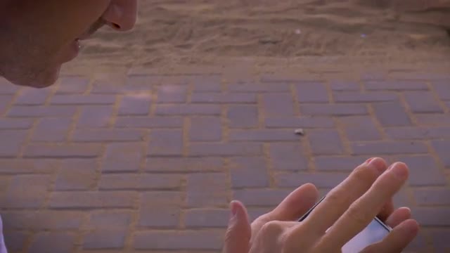 Man uses mobile cell smart phone while sitting on the beach