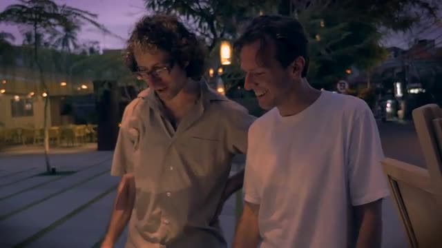 > Slow motion of two male friends talking and walking together