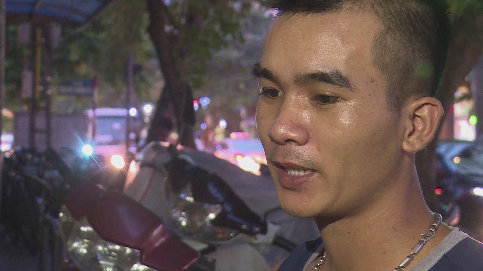 > Steadicam follows a bearded young man with tattoos waiving to people