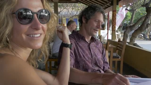 A young, thin, blond woman twirls her hair while a man looks over a menu in an outdoor cafe or restaurant in a warm tropical setting.