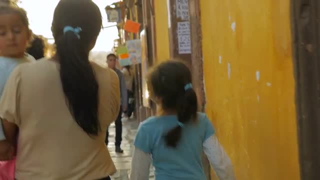SAN MIGUEL DE ALLENDE, MEXICO - CIRCA MAY 2016 - A mother and her young son enter an old church in slow motion steadicam shot.