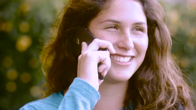 An attractive young woman with long brown hair answers her phone and smiles outside