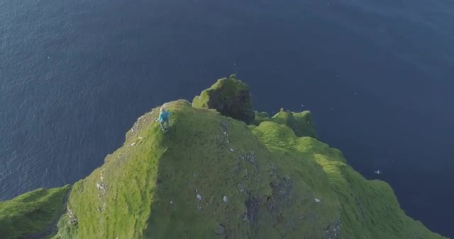 Aerial of a cliff revealing a hiker standing on the edge of the green peak