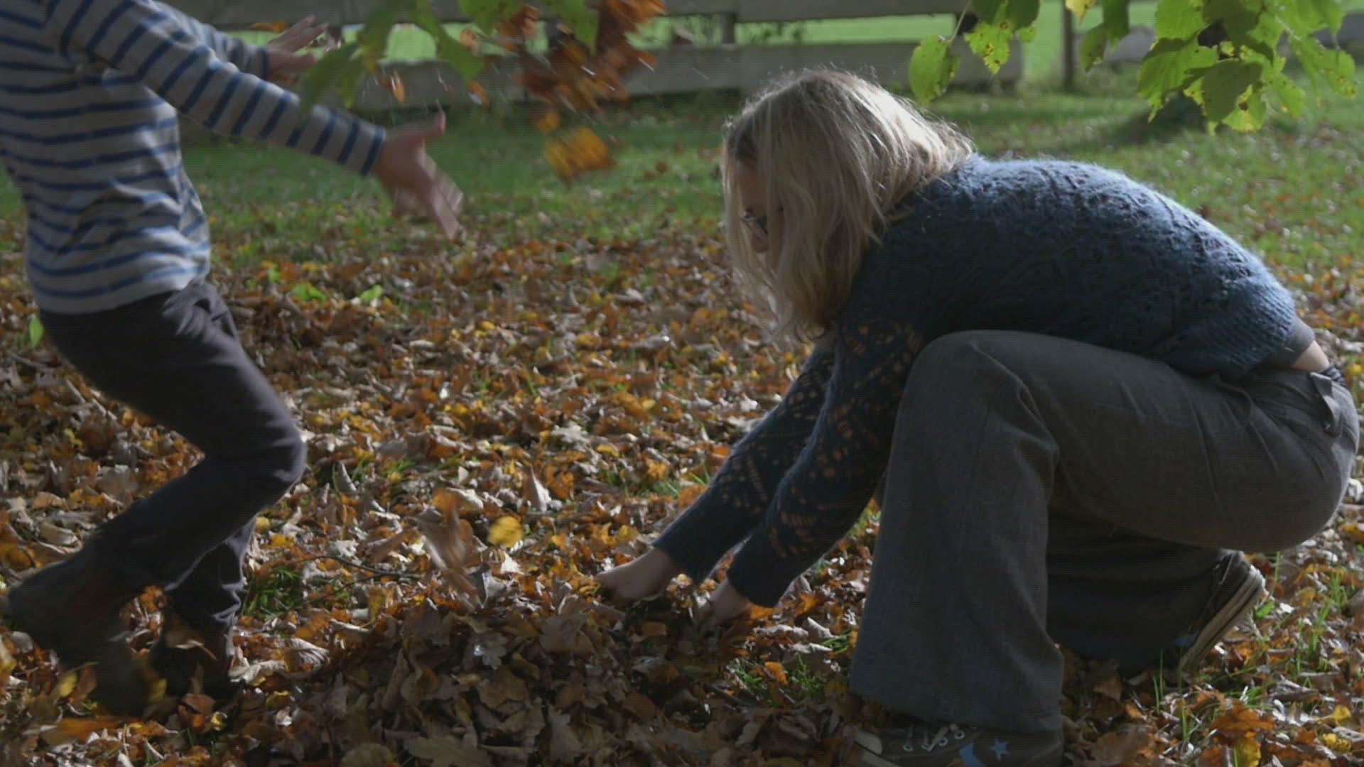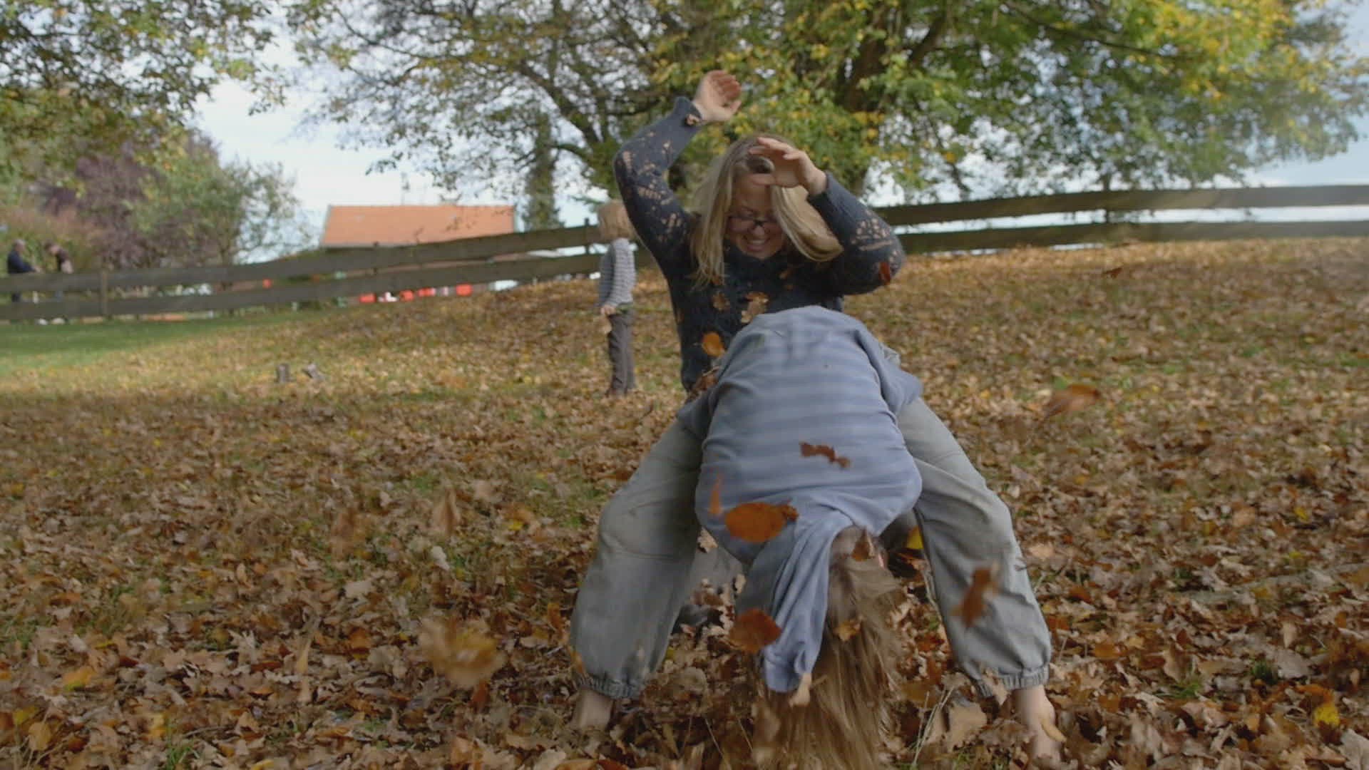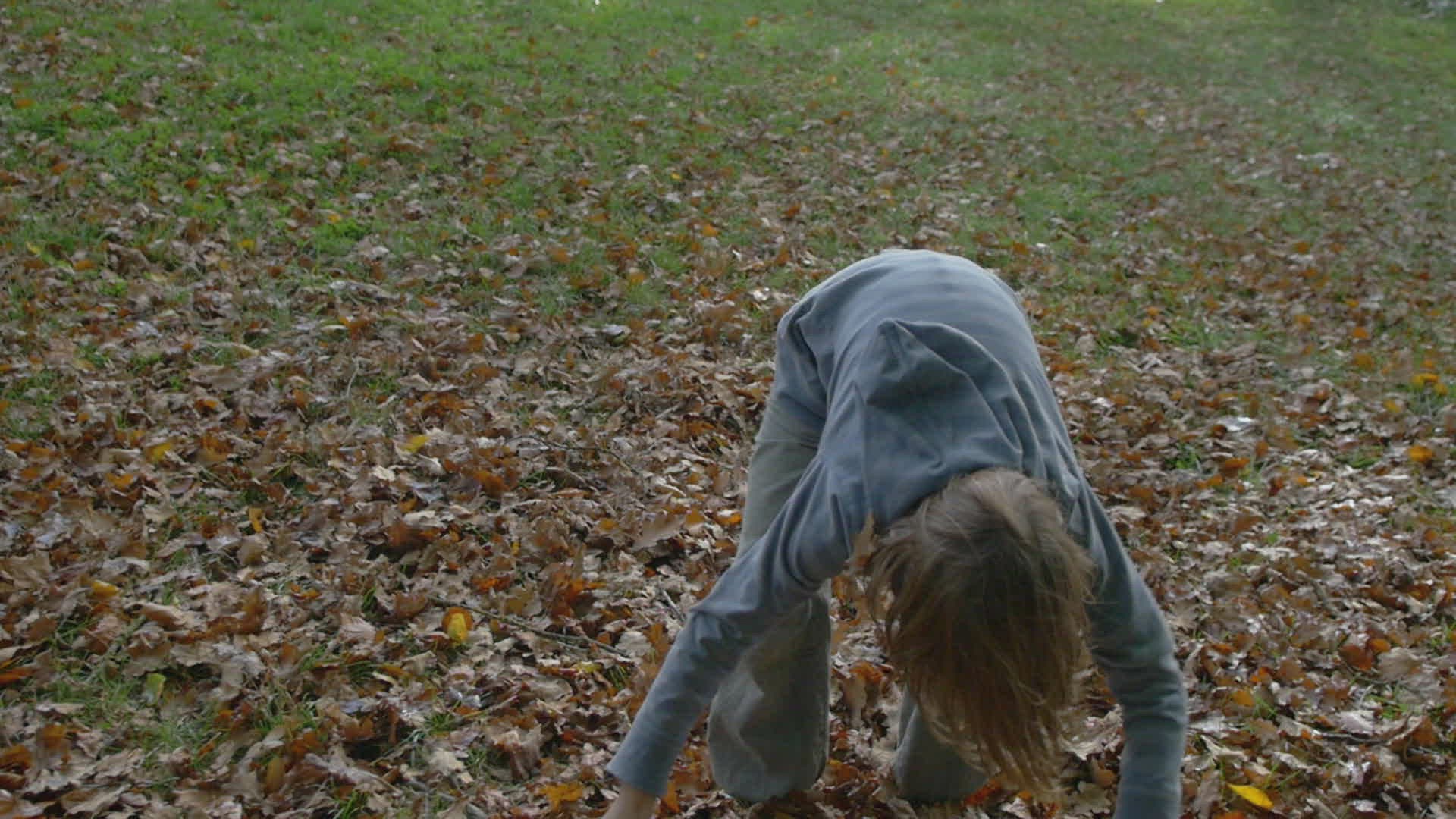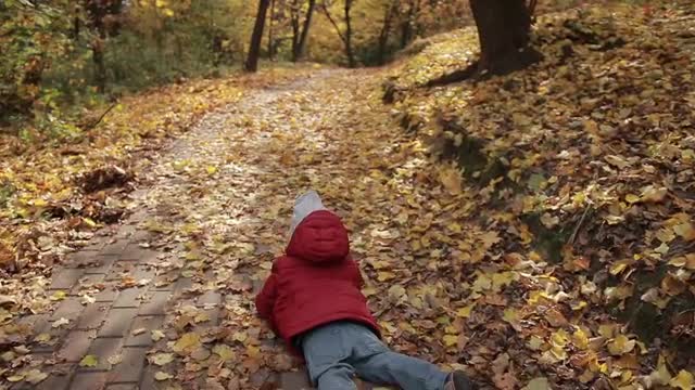 Smiling boy in jacket and hat running on walkway covered with yellow fallen leaves in autumn park. Cute toddler child falls down on road and starts crying as he plays outdoors in fall day over golden autumn landscape. Stabilized shot. Slo mo.