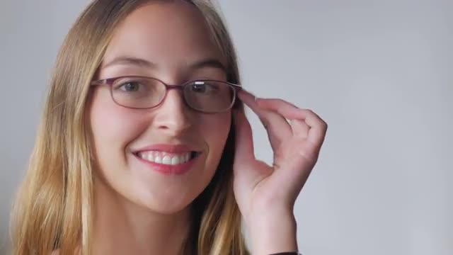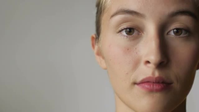 An attractive young smiling blond woman plays with her healthy hair in slow motion against a white backdrop