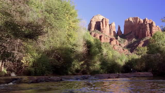 Reflection of red rock glow in slow moving river in Sedona Arizona.