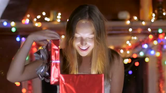 A pretty blond haired woman opens a gift with colored lights behind her