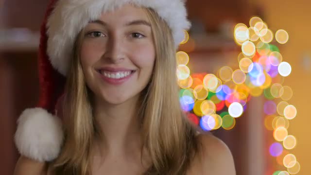 Close up portrait of a beautiful, attractive, young woman wearing a Santa hat in front of a fireplace and colored Christmas lights
