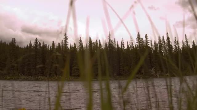 726894 - Dolly left pull focus from grass to forest background with running river