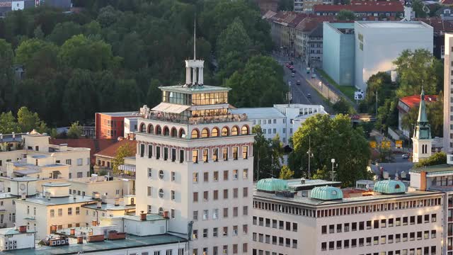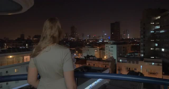 > Woman enjoying view of night city from the rooftop. Tel Aviv, Israel
