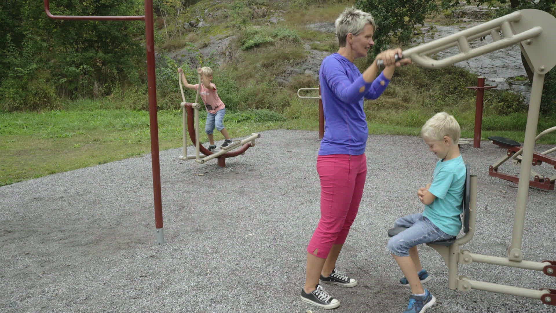 Child playing with street walker exerciser while his friend leaving the sports ground