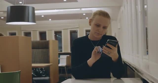Young woman sitting alone in cafe and browsing social media on mobile