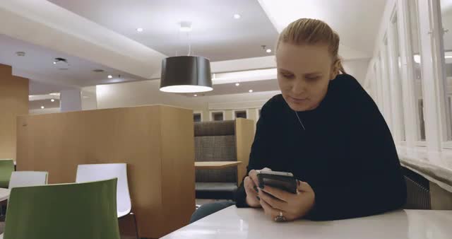 Young blond woman spending time in cafe and surfing internet on cell
