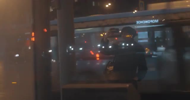Young woman taking mobile selfie on the background of busy night city. View through the glass of bus stop