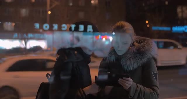 Two women friends using digital tablet in the evening city. Road with intense car traffic in background. View through the glass