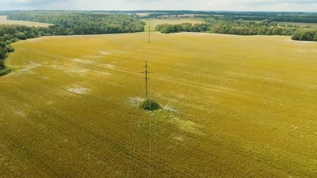 Power pylons and high voltage lines in an agricultural landscape. Aerial view row of high-voltage masts in the field. Electricity transmission power lines. Aerial footage.