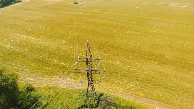Power pylons and high voltage lines in an agricultural landscape. Aerial view row of high-voltage masts in the field. Electricity transmission power lines. Aerial footage.