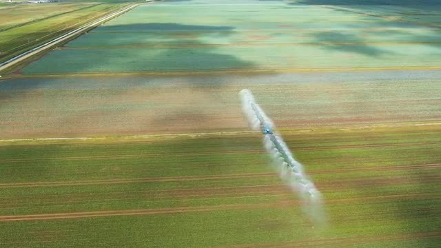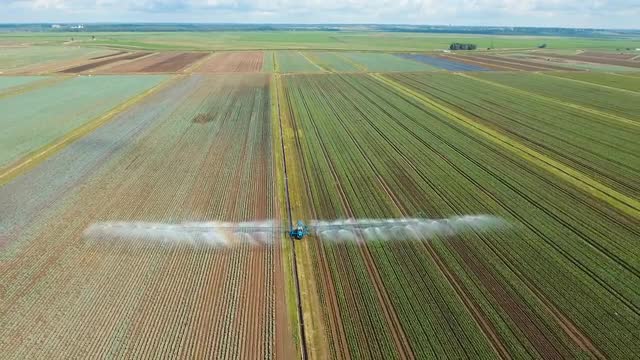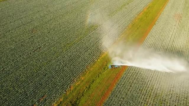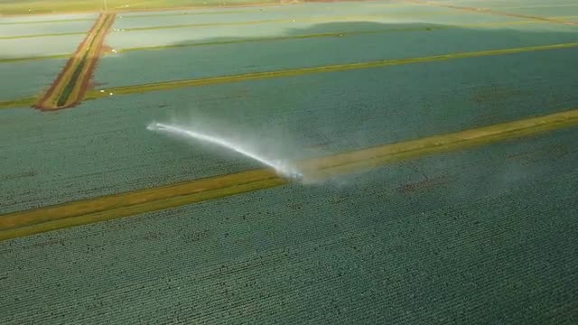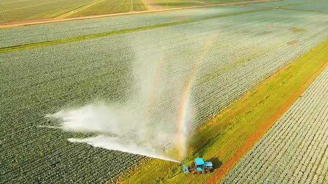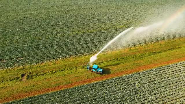 Aerial view: Irrigation equipment watering cabbage field. Irrigation system watering farm field, 4K