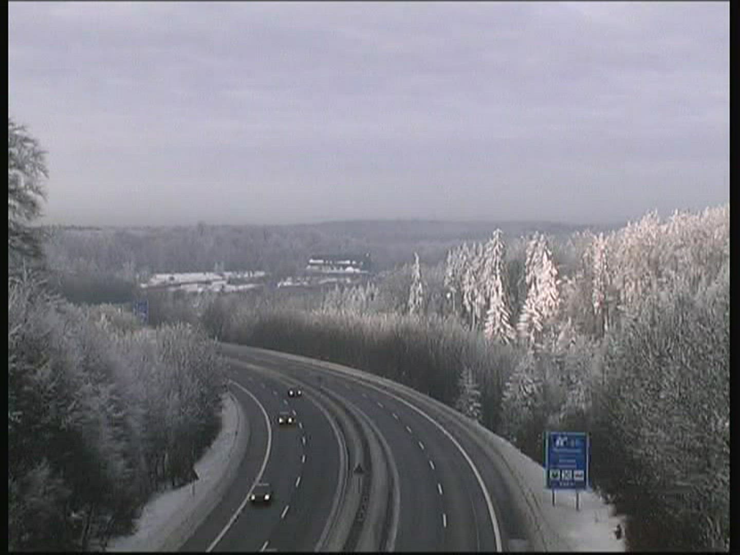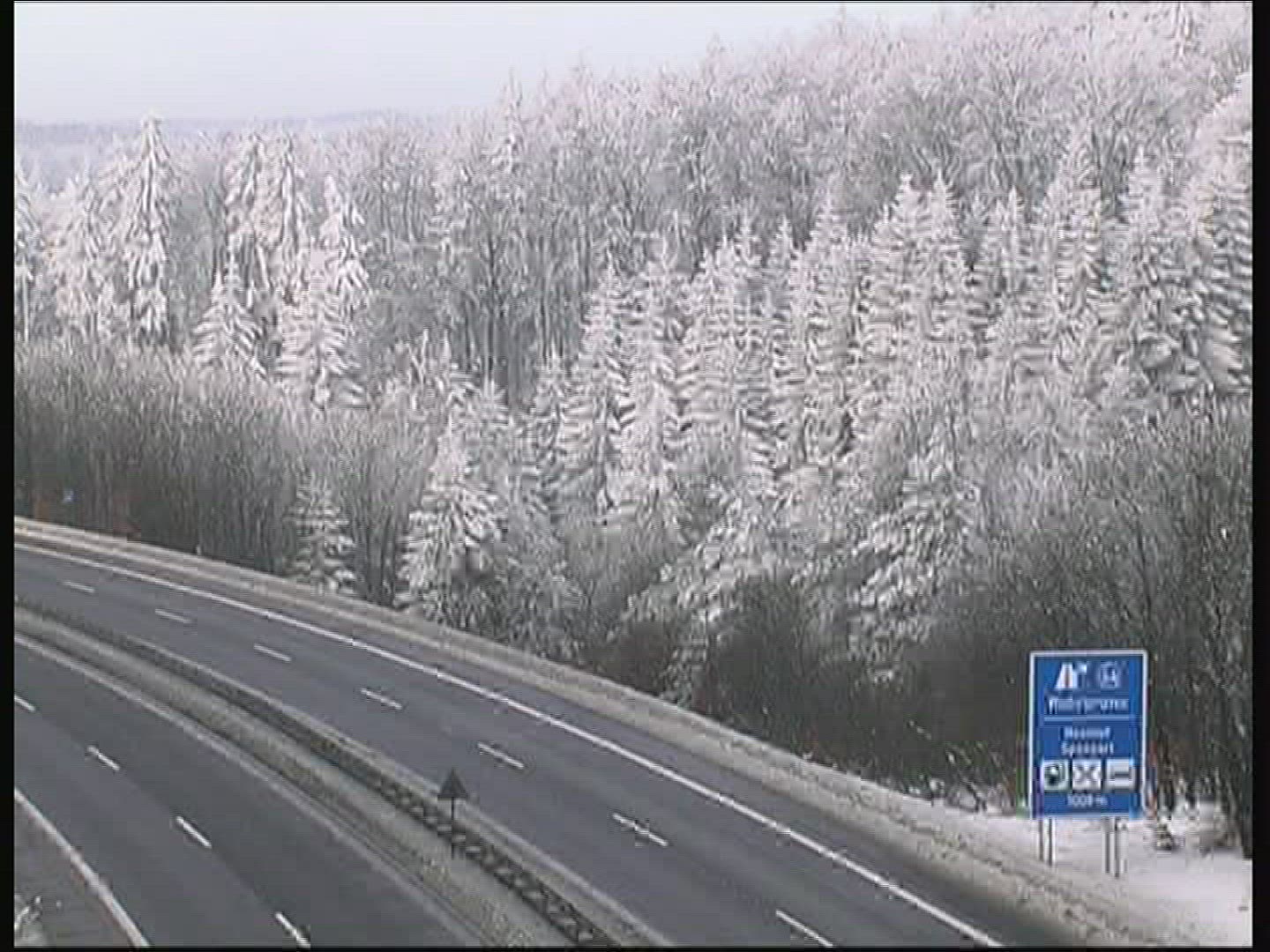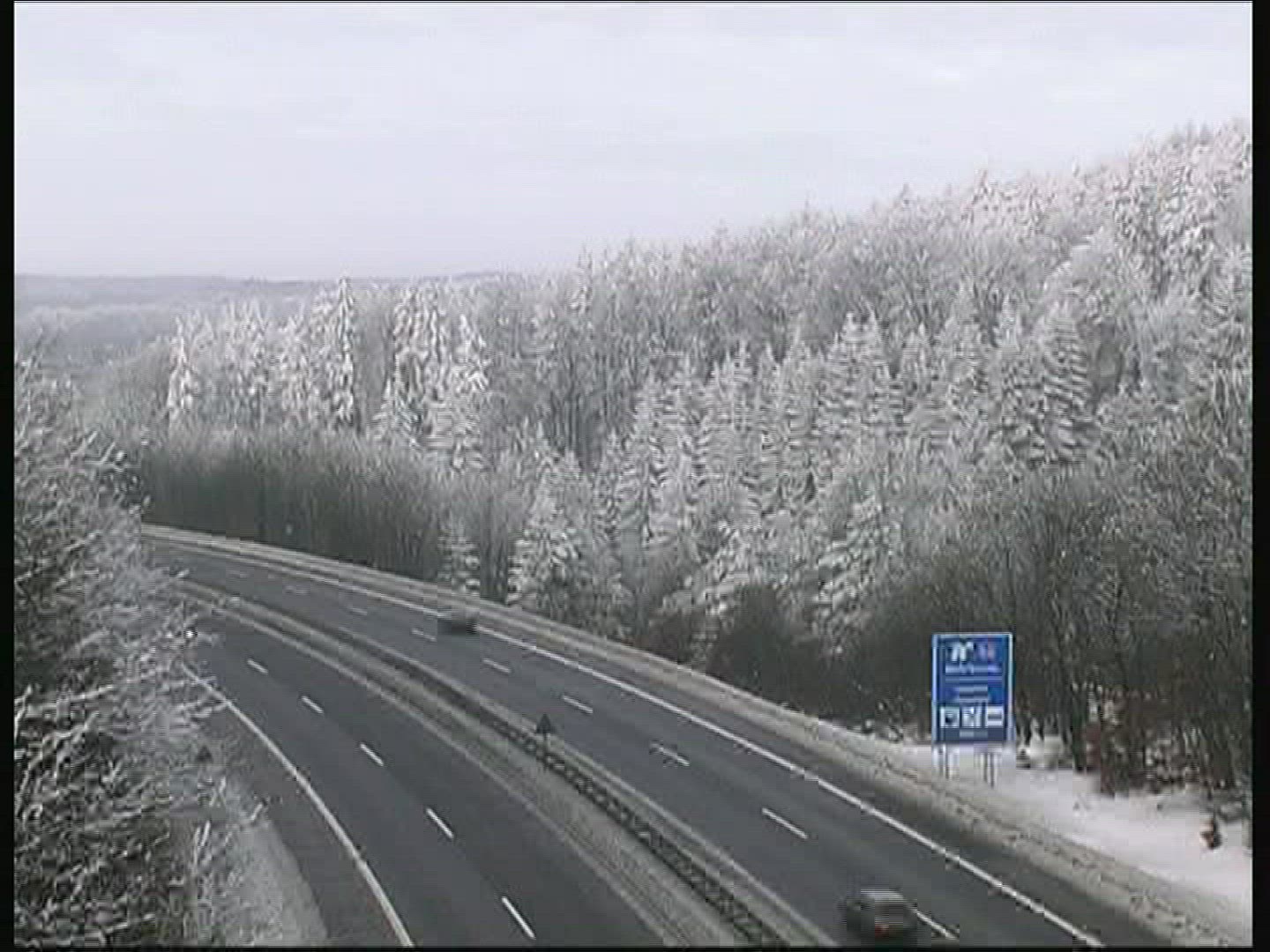 Road sign warning of dangerous right curve and sign no passing on the highway in the forest. 4K video