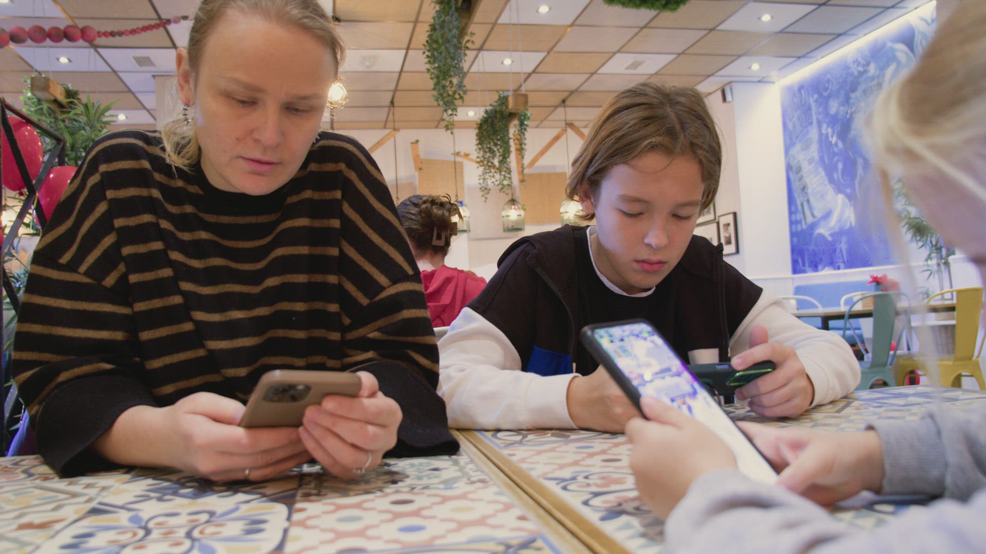 Woman taking photos of her friend who drinking fruit cocktail in cafe. Then they looking at shots to share in social media. View through the glass