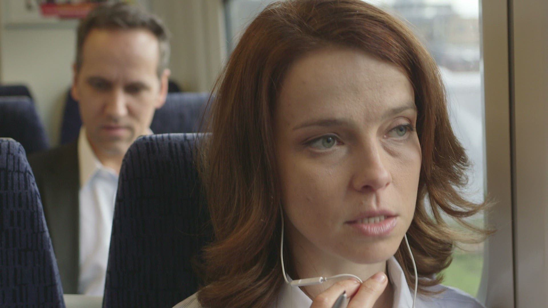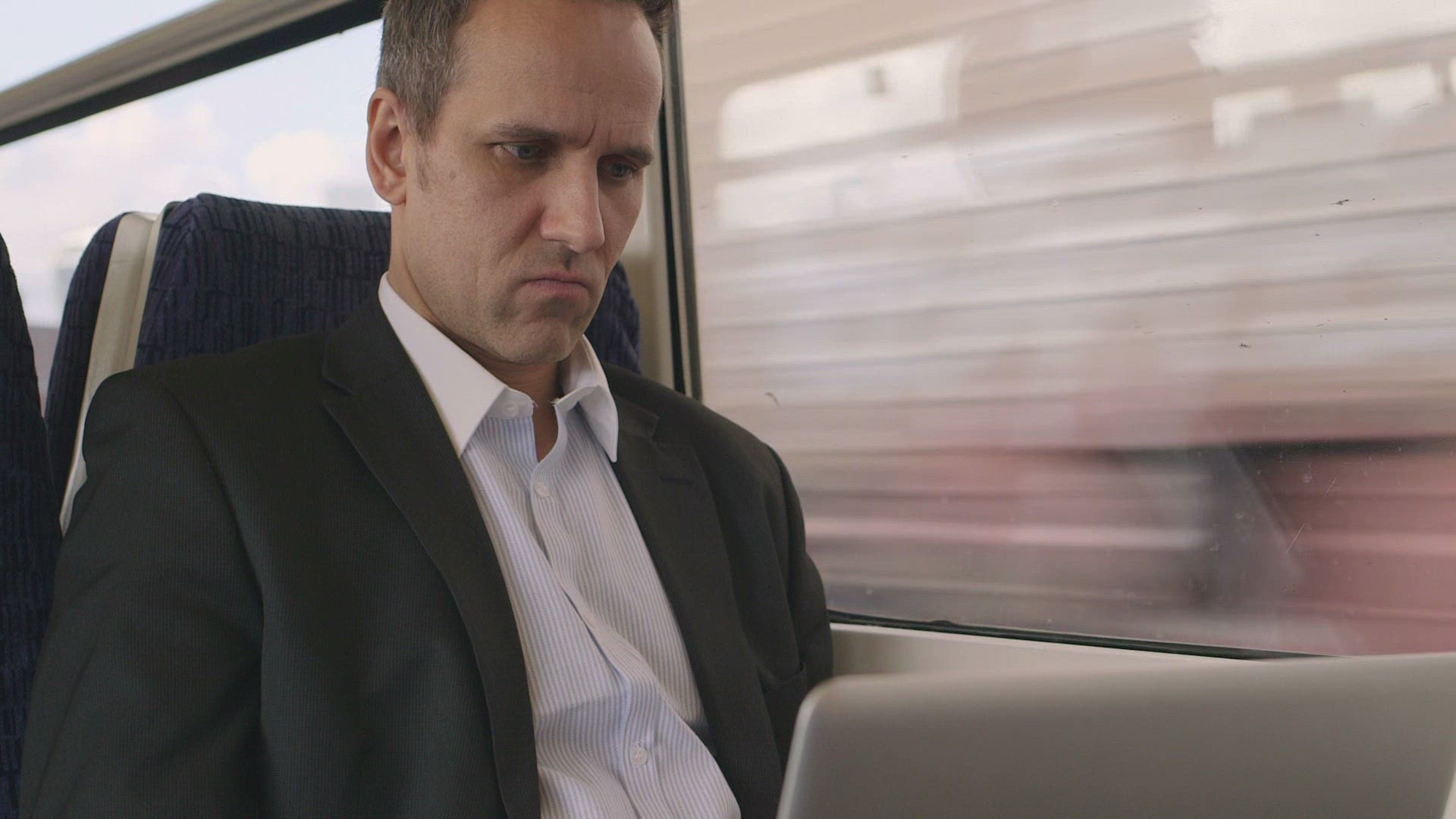 Man and woman passengers using laptop and mobile during traveling by express train in late evening