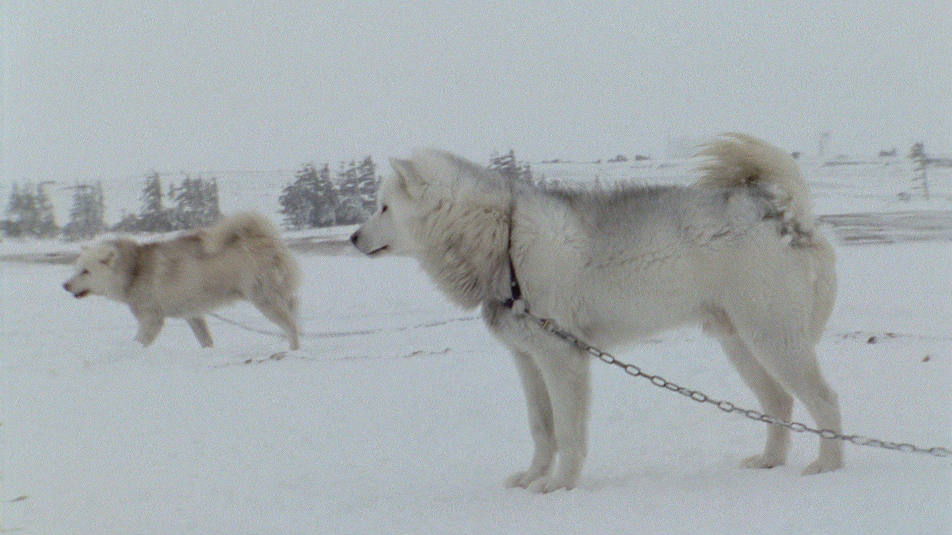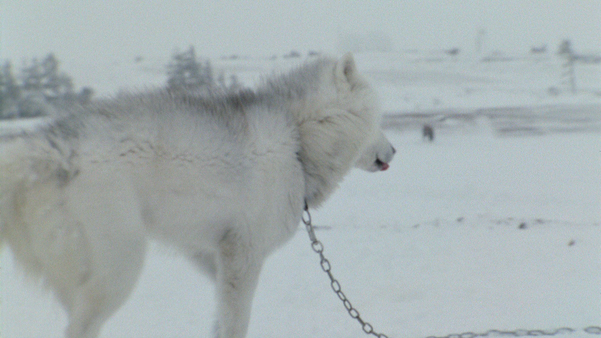 Group of husky dogs pulling sledge in winter forest. View from the moving sled. Traveling in the north, Finland