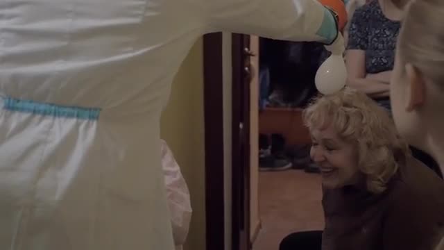 Slow motion shot of family watching science demonstration and having fun. Chemist placing a drop on a head of senior woman and it is bursting into white smoke. Dry ice experiments