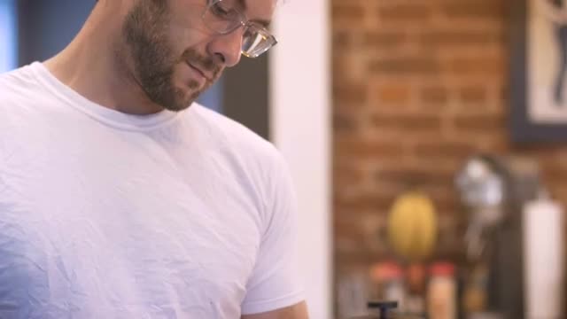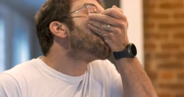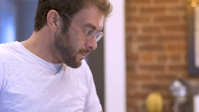 > An elderly man talking while sitting next to his pills and medication SLOMO