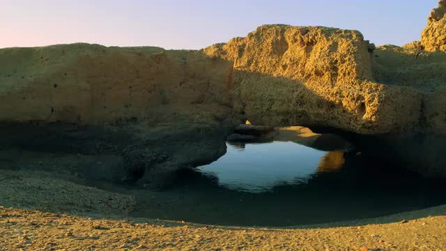 This is a very slow pan of a rock arch over a Mediterranean coastal pool at Dor Beach, Israel with a nice reflection of the sky in the water and the beach in the foreground. Shot with the Red One camera at 4k (4096 x 230) resolution on 02/18/2011.