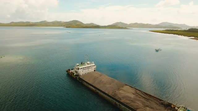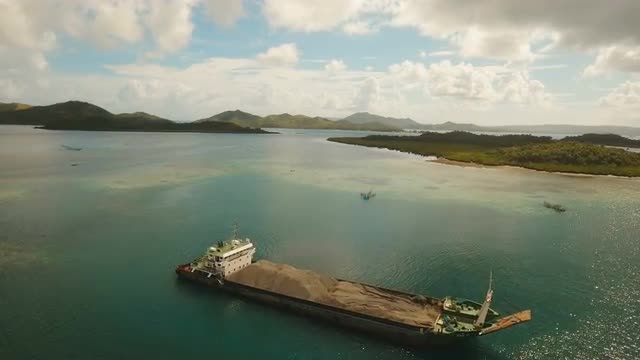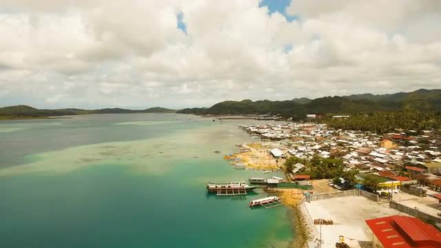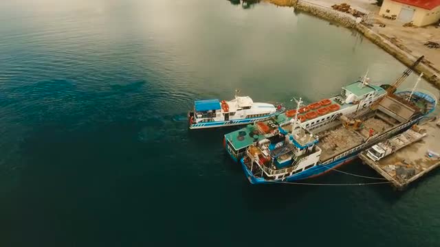 Cargo and passenger port with barges and cargo ships on tropical island. Aerial view:passenger ferry terminal Dapa city .Ferries for transport vehicles and passengers in the port. Philippines, Siargao. 4K video.Travel concept. Aerial footage.