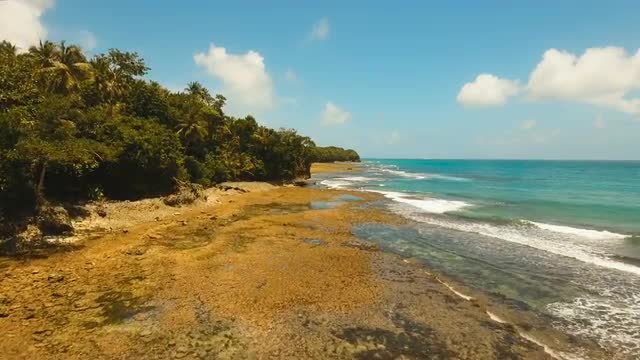 Aerial view Rocky beach with palm trees, blue water on a tropical island. Viewpoint along stony beach with rocks.Stony sea beach scene. Philippines. 4K video. Travel concept. Aerial footage.