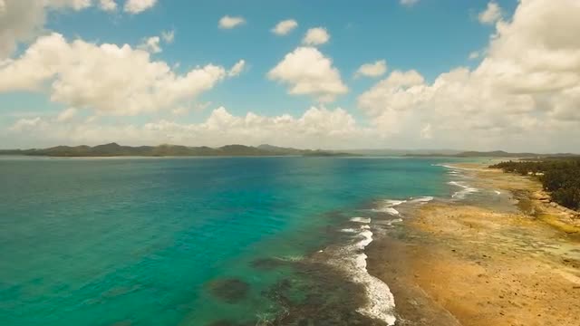 Aerial view of tropical beach on the island Siargao, Philippines. Beautiful tropical island with sand beach, palm trees. Tropical landscape: beach with palm trees. Seascape: Ocean, sky, sea . Philippines. 4K video. Travel concept. Aerial footage.