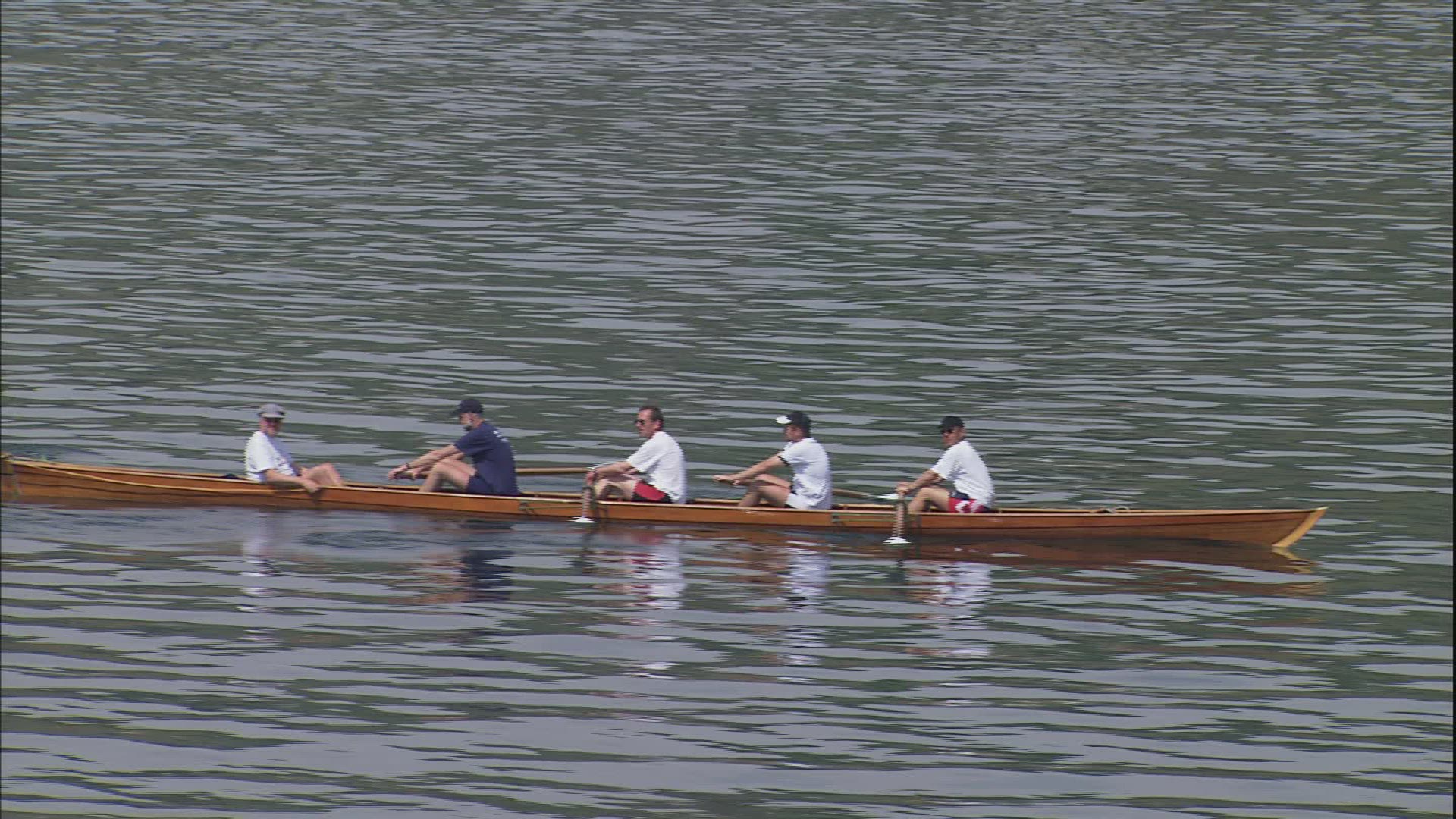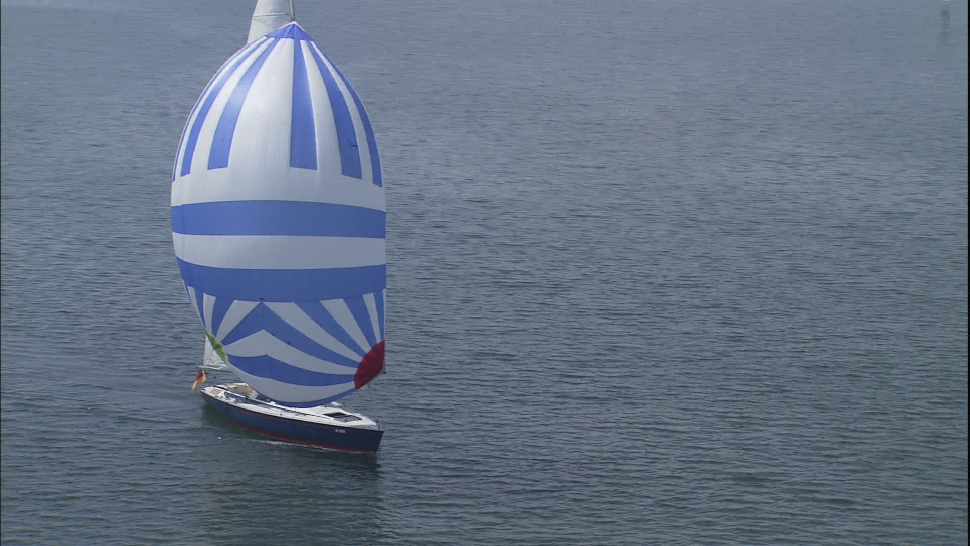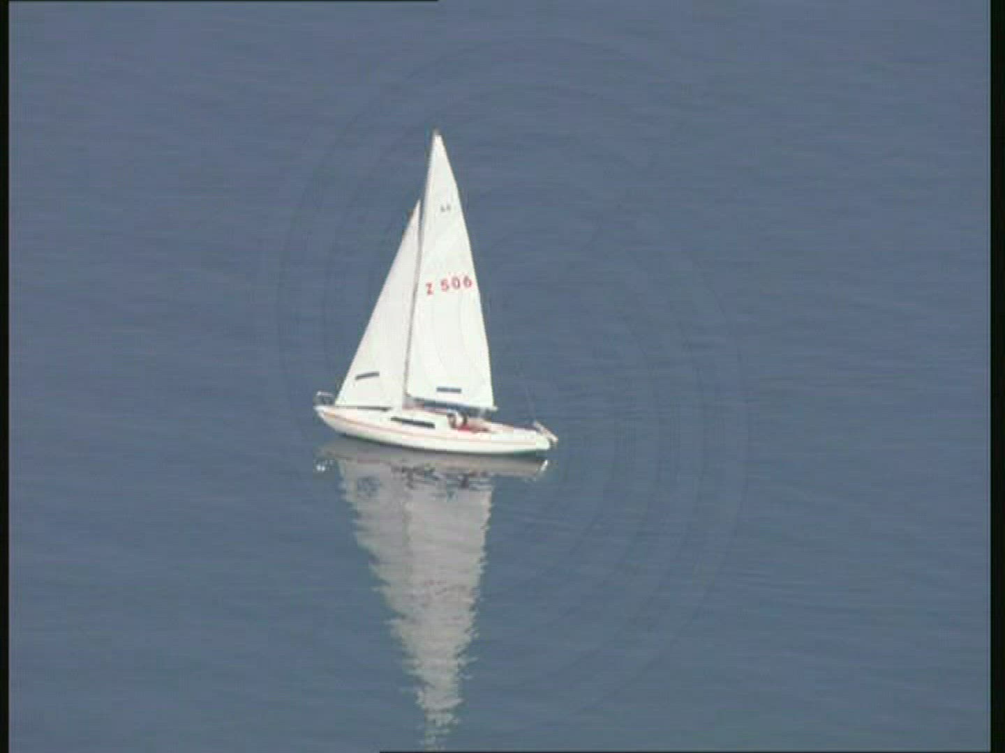 796759 - Aerial flying above blue lake with a boat moving down a channel