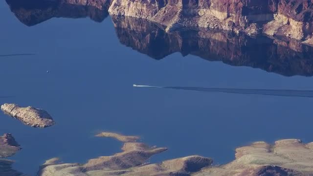 796275 - Aerial flying above blue lake with a boat moving down a channel