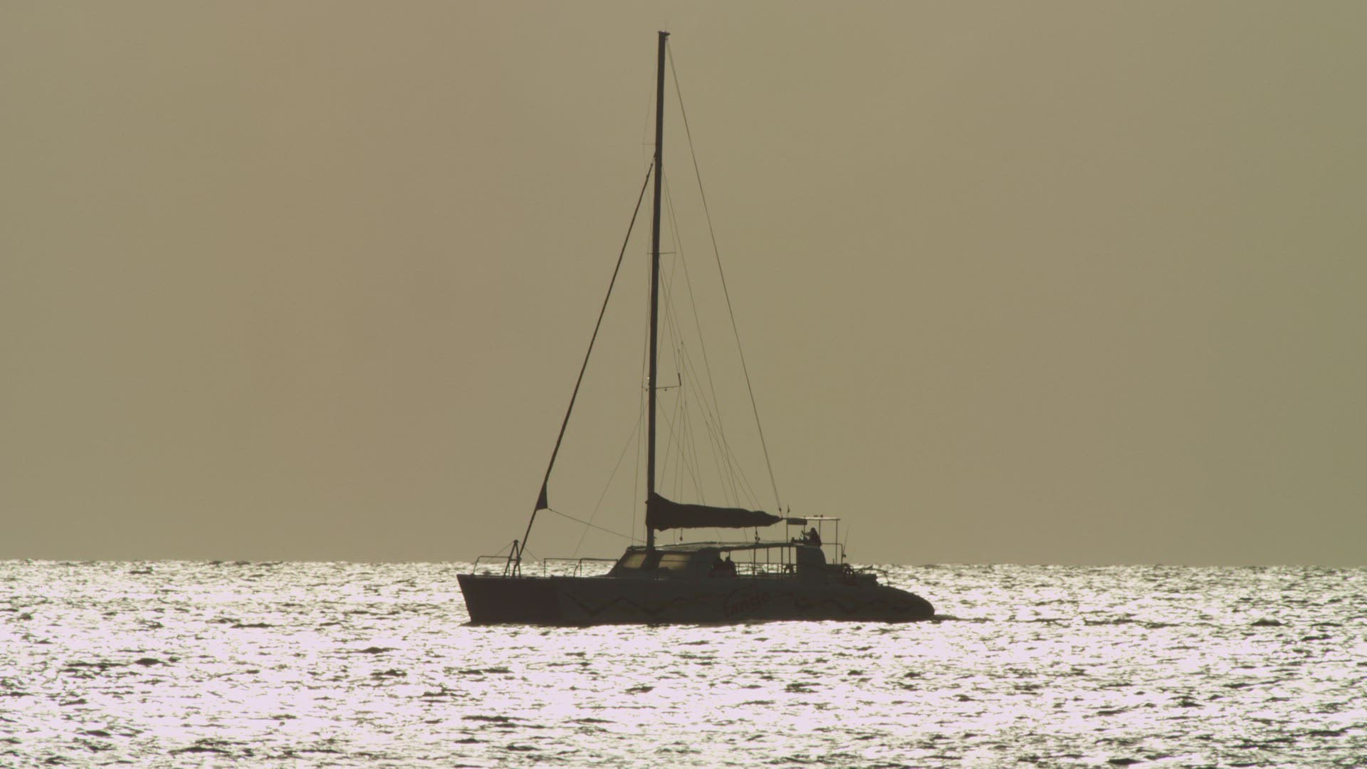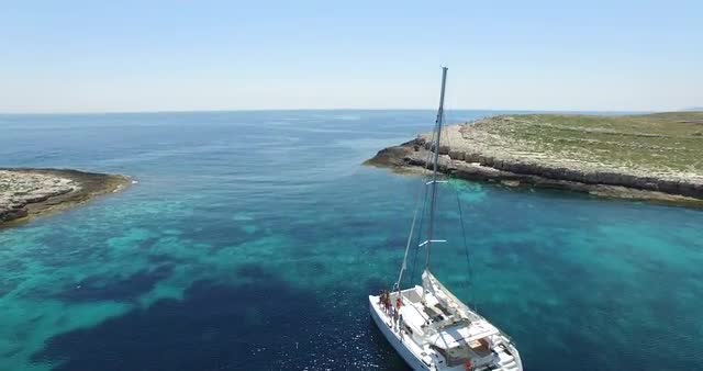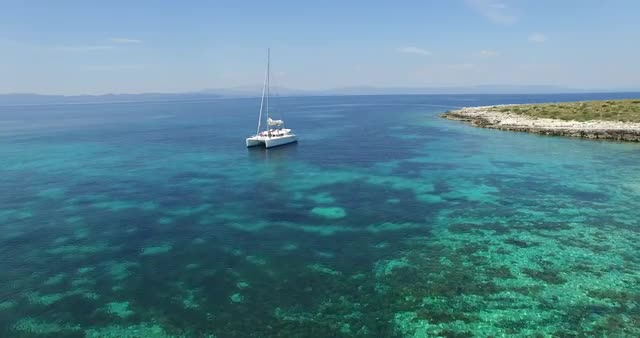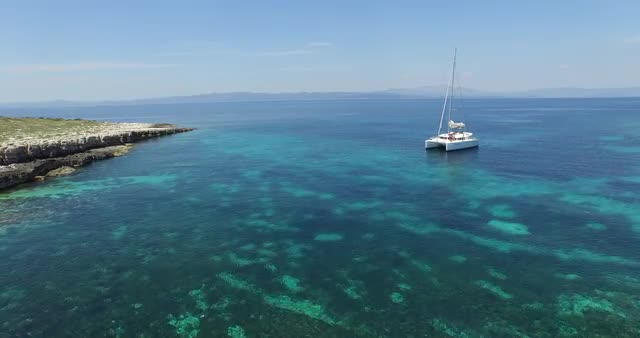 711736 - Aerial scene of catamaran anchored in virgin coast. Natural landscape. Camera rises to a panoramic