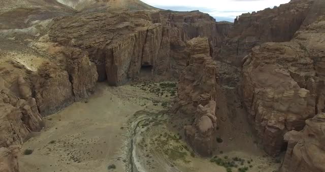 731749 - Aerial drone scene of big canyon in dry climate, chubut, argentina. Piedra parada. Camera moves on
