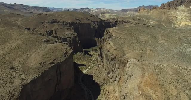 731492 - Aerial drone scene of big canyon on Patagonia, Argentina. Camera moves slowly upwards. Panoramic