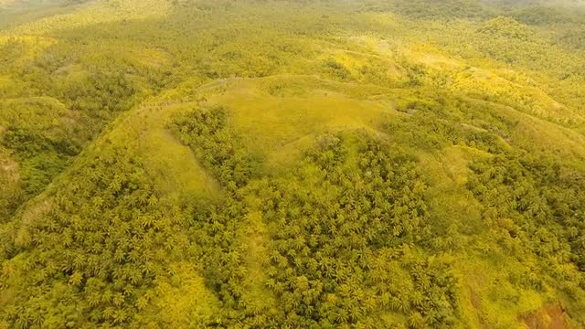 Mountains with rainforest covered with green vegetation and trees on the tropical island, landscape. Aerial view: Mountains and hills with wild forest. Hillside rainforest and jungle. Philippines, Siargao. 4K video. Aerial footage.