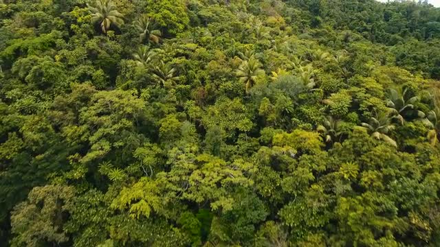 Mountains with rainforest covered with green vegetation and trees on the tropical island, landscape. Aerial view: Mountains and hills with wild forest. Hillside rainforest and jungle. Philippines, Siargao. 4K video. Aerial footage.