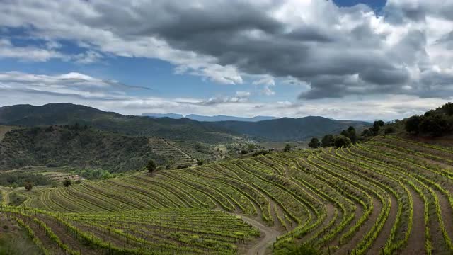 > Vineyard plantation, clouds and mountains
