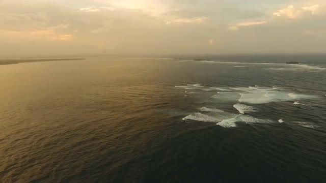 Sunset over the sea. Aerial view: Sunset over the sea in the background orange sky. Fly over the ocean in sunset time. Travel concept. Nothing but sky, clouds and water. Beautiful serene scene.Philippines, Siargao. 4K video. Aerial footage.