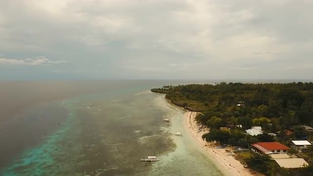 Aerial view of tropical beach on the island pamilacan, Philippines. Beautiful tropical island with sand beach, palm trees. Tropical landscape: beach with palm trees. Seascape: Ocean, sky, sea. 4K video. Travel concept. Aerial footage.