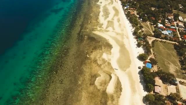 Aerial view of tropical beach with beach,resort, hotels on the island Bohol, Anda area, Philippines. Beautiful tropical island with sand beach, palm trees. Tropical landscape: beach with palm trees. Seascape: Ocean, sea. 4K video. Travel concept. Aerial footage.
