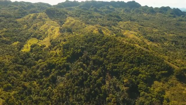 Rainforest, jungle covered with green vegetation and trees on the tropical island, landscape. Aerial view: Mountains and hills with wild forest. Hillside rainforest and jungle. Philippines, Siargao. 4K video. Aerial footage.