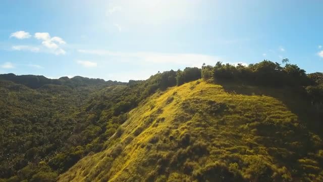Rainforest, jungle covered with green vegetation and trees on the tropical island, landscape. Aerial view: Mountains and hills with wild forest. Hillside rainforest and jungle. Philippines, Siargao. 4K video. Aerial footage.